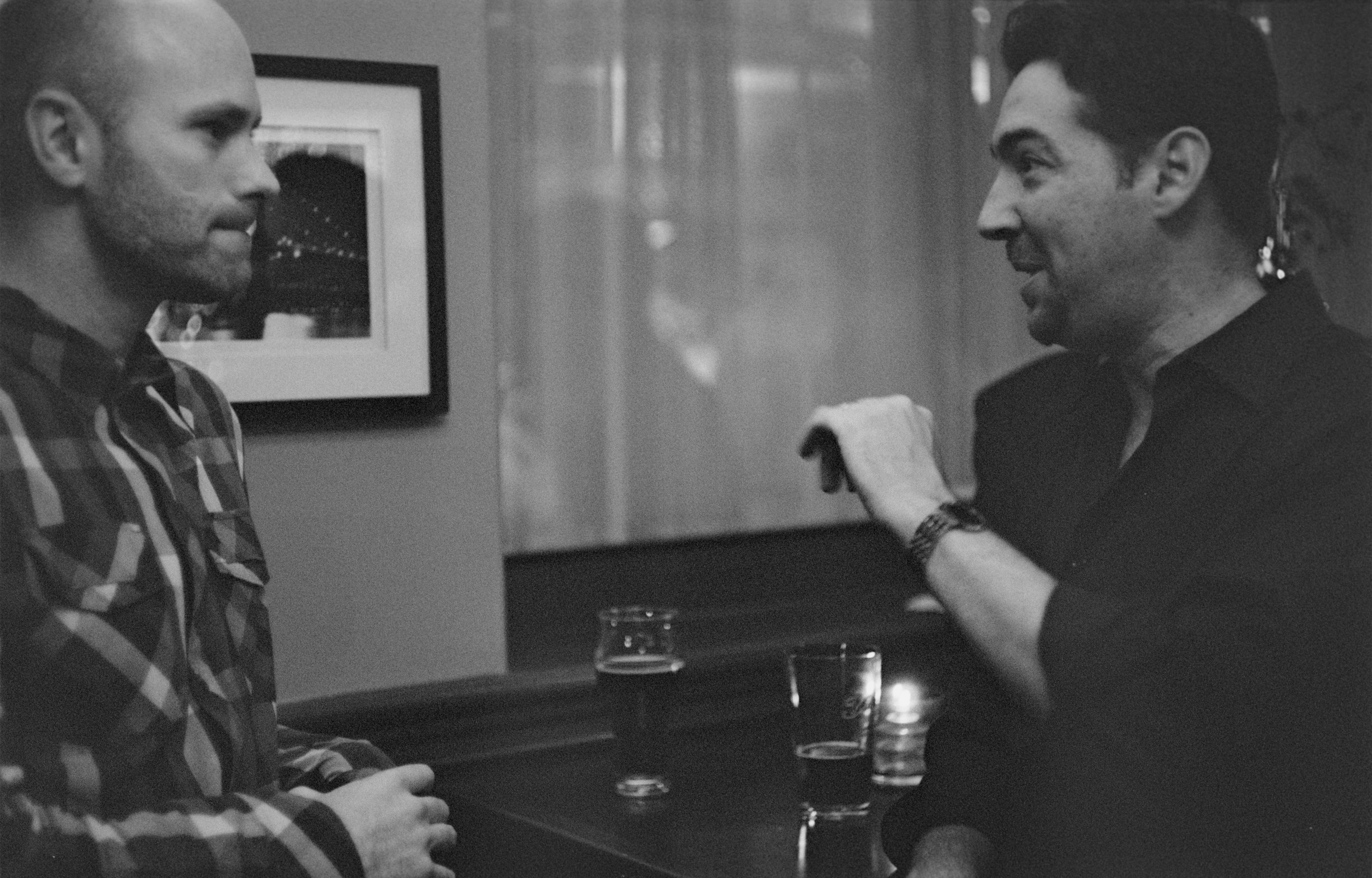 I went to a friend’s bachelor party/dinner this weekend, and knowing everyone would have their iPhones and digicams handy, I decided to be a little different. I wasn’t going to be bringing a bag (I ALWAYS seem to have a bag), so I brought the relatively petite Leica IIIa (my happy accidents camera), mounted with a 50mm collapsible Summicron and loaded with Tri-X. I’m terrible at metering-by-eye in low light, but I didn’t want to bring my Voigtlander VCII shoe-mount light meter and make the camera any bigger.