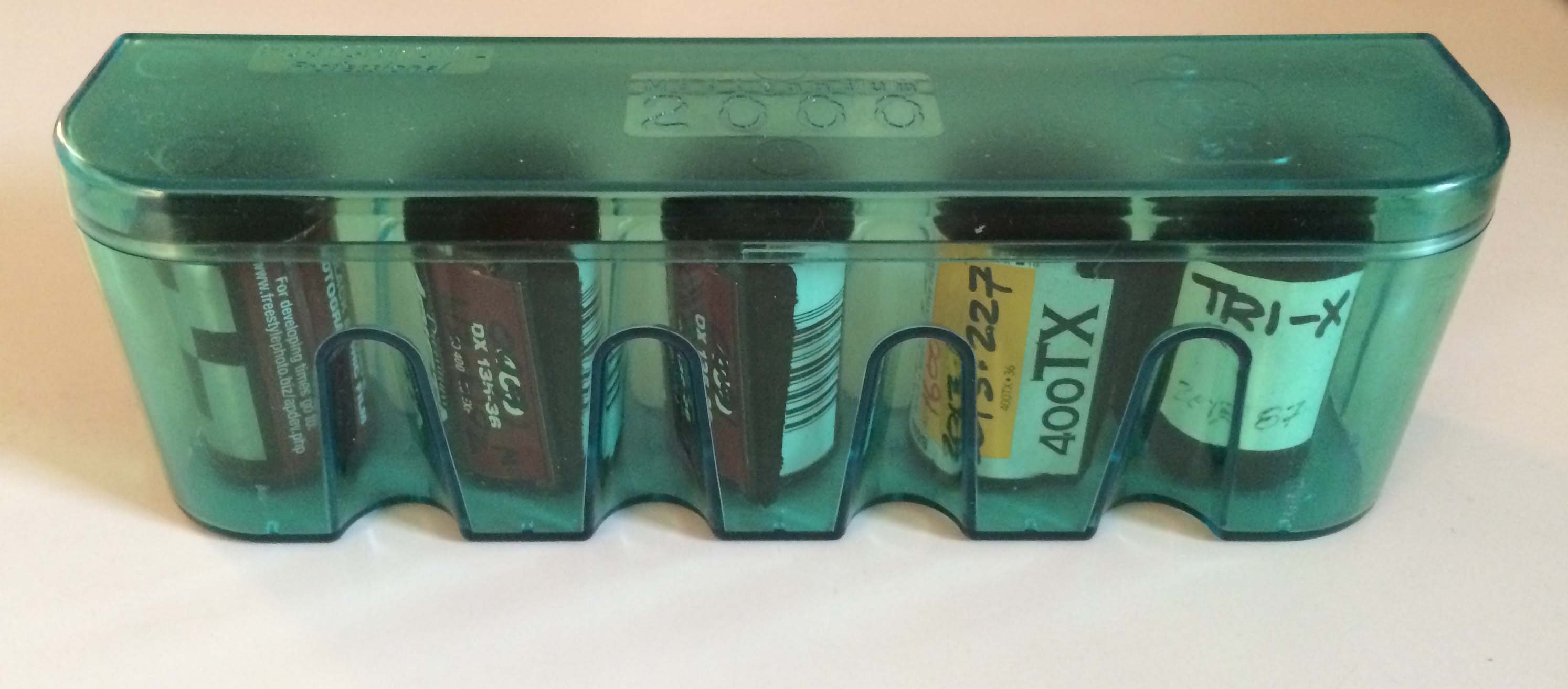 Let’s say I’m loading a 5-roll Paterson tank. I have my reels, tank, unopened film cartridges, etc. in the changing bag or in the dark darkroom. I also have one of these nifty film boxes (see above). This particular one is a Fujichrome Professional Millennium 2000 case that I think I bought from Mijonju, who had filled it with Neopan 1600. Anyway, it’s not a great film case (somewhat fragile) but it’s perfect for this purpose: